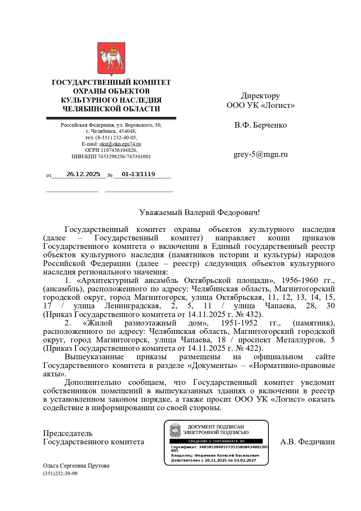 Уважаемые собственники МКД! Информируем Вас о признании объектов культурного наследия регионального значения в жилом фонде ООО УК "Логист"