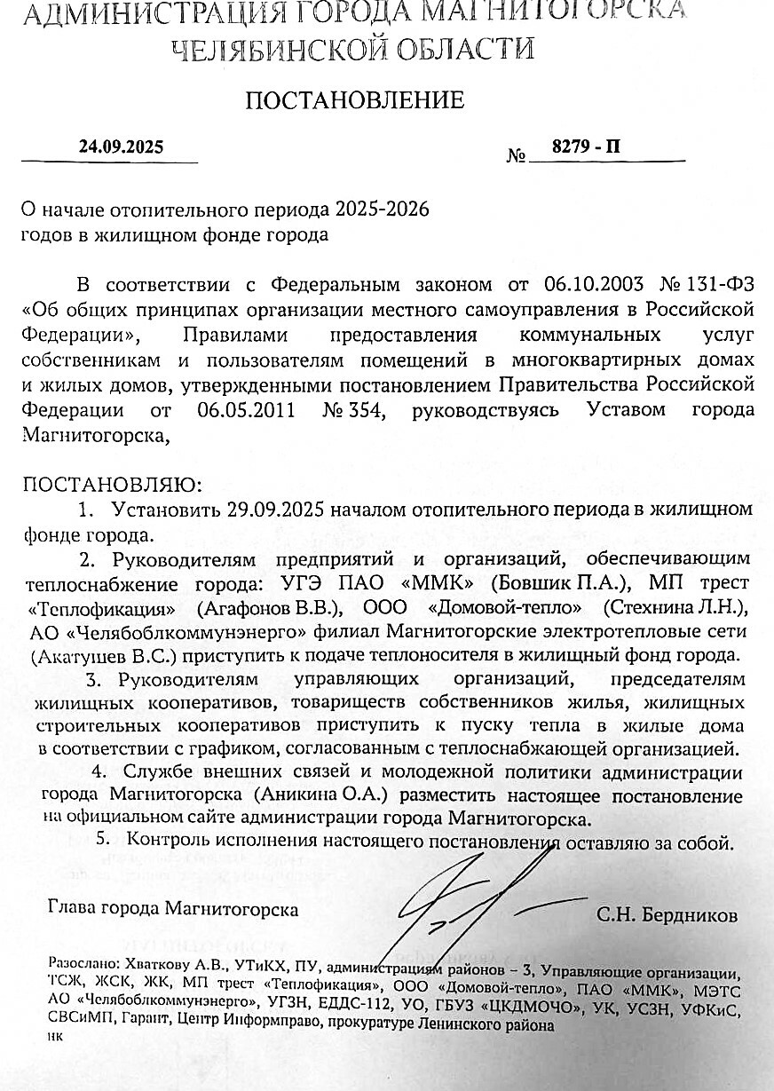 Постановление Администрации города Магнитогорска № 8279-П от 24.09.2025 г. о начале отопительного периода 2025-2026 гг.